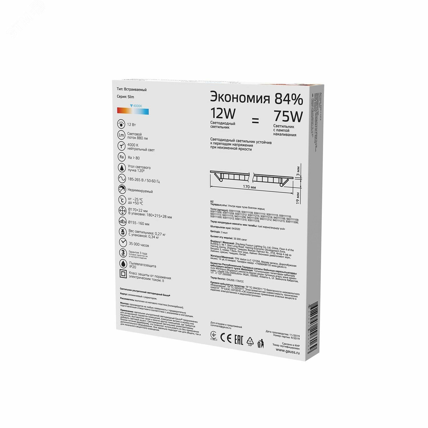 Встраиваемый светильник Gauss ультратонкий круглый IP20 12W,170х22, 155, 4000K 880лм 1/20