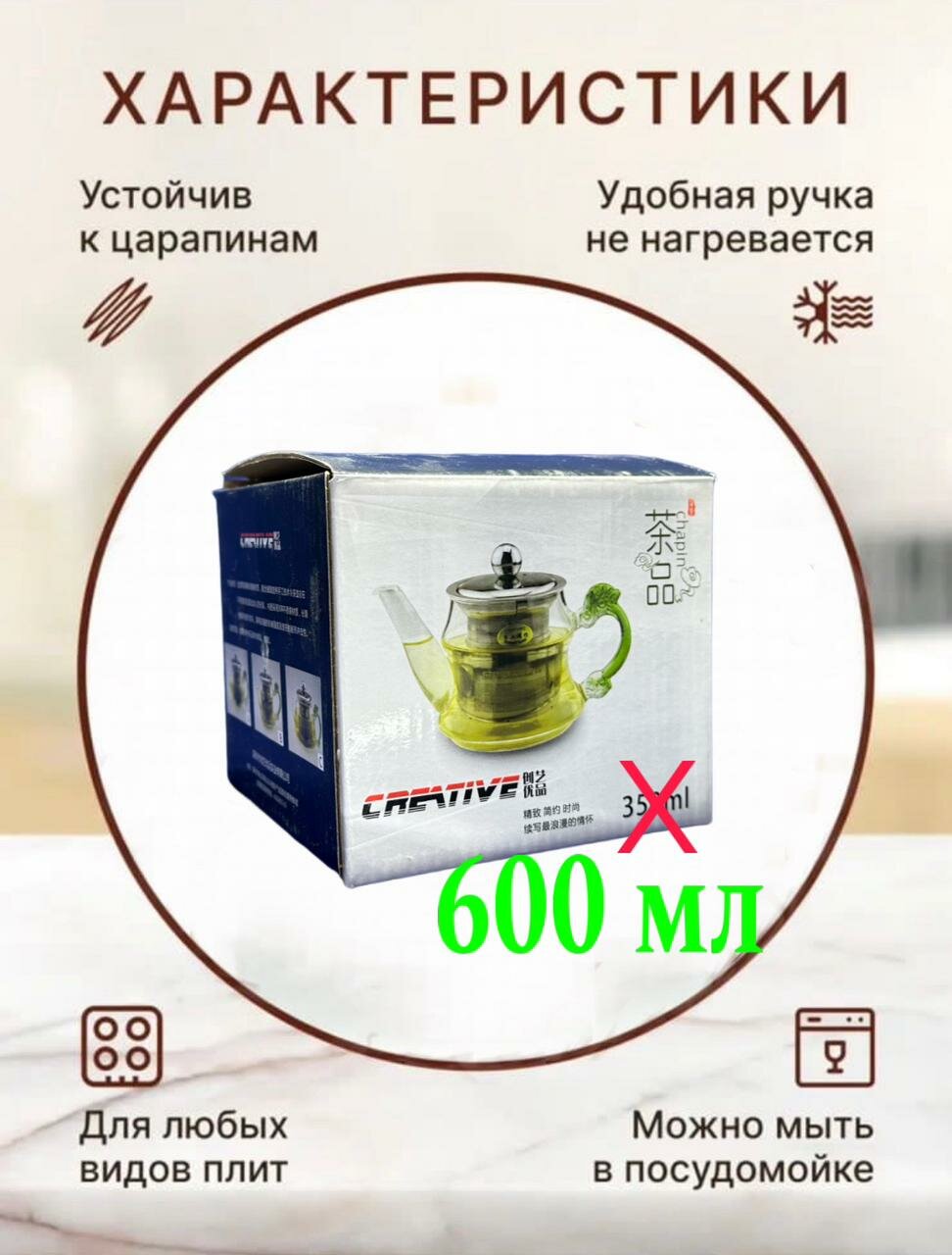 Чайник заварочный стеклянный 600 мл,посуда мира с бамбуковой крышкой + фильтр, прозрачный интересное: