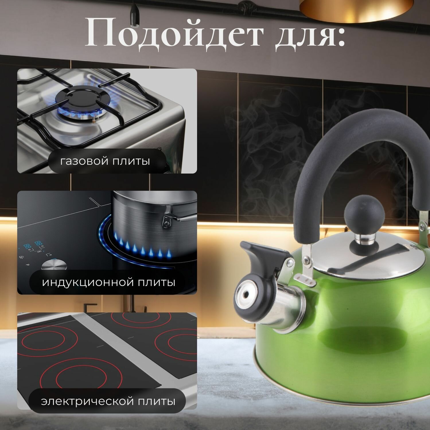 Чайник со свистком 2,5 л для плиты газ индукция электрическая, нержавеющая сталь, зеленый металлик, PERFECTO LINEA