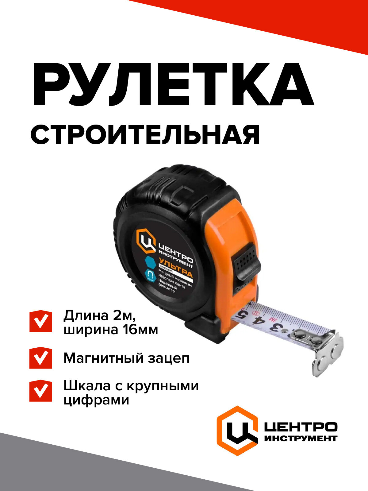 Рулетка строительная с автостопом Центроинструмент ультра 2М-16ММ, магнитная интересное: