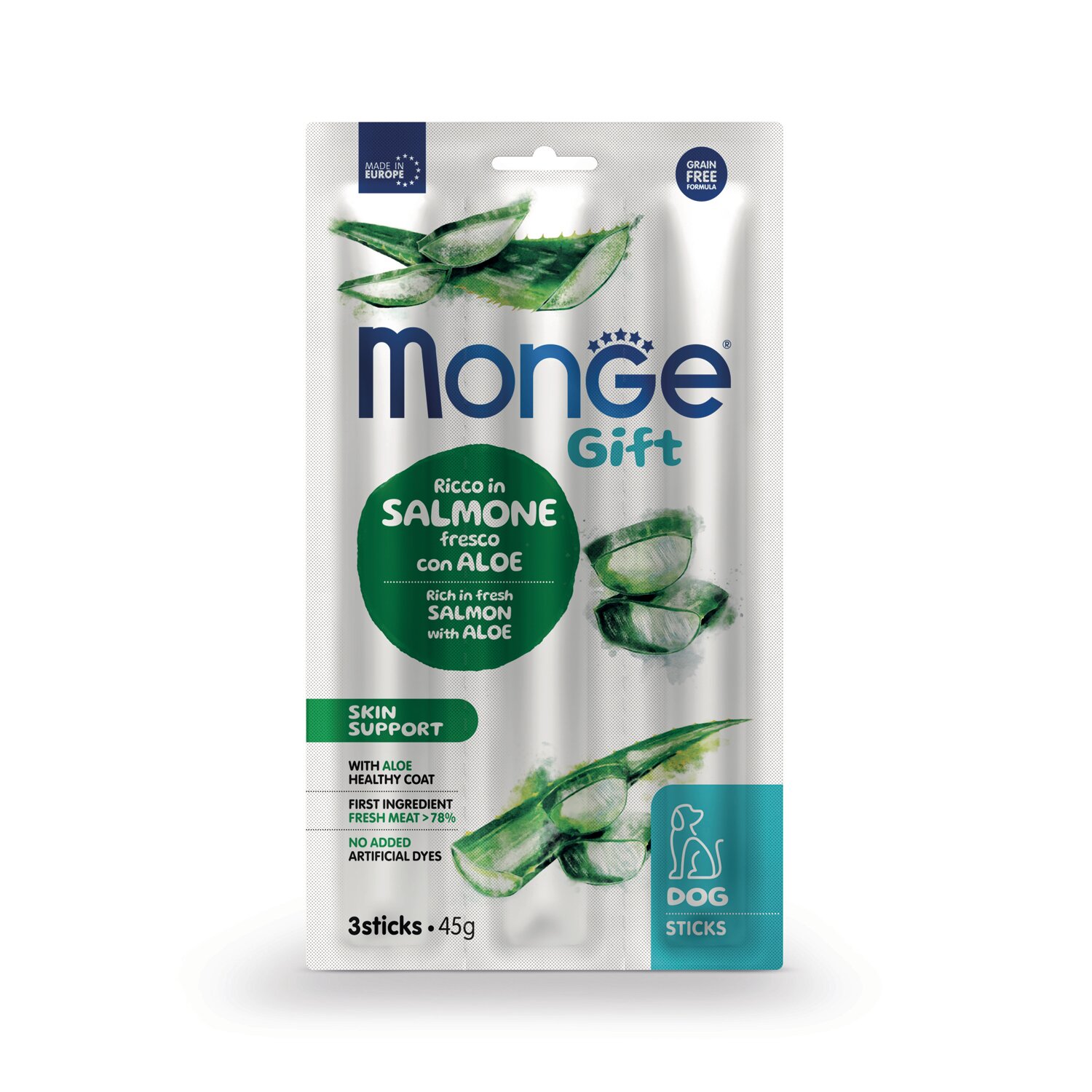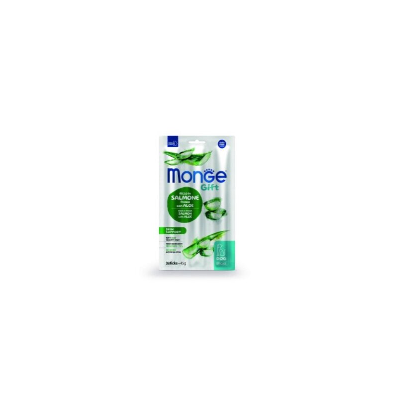 Лакомство Monge Gift Skin support для собак всех пород "Мягкие палочки" со свежим лососем, алоэ вера и дрожжами для здоровой кожи 45 г х 16 шт.