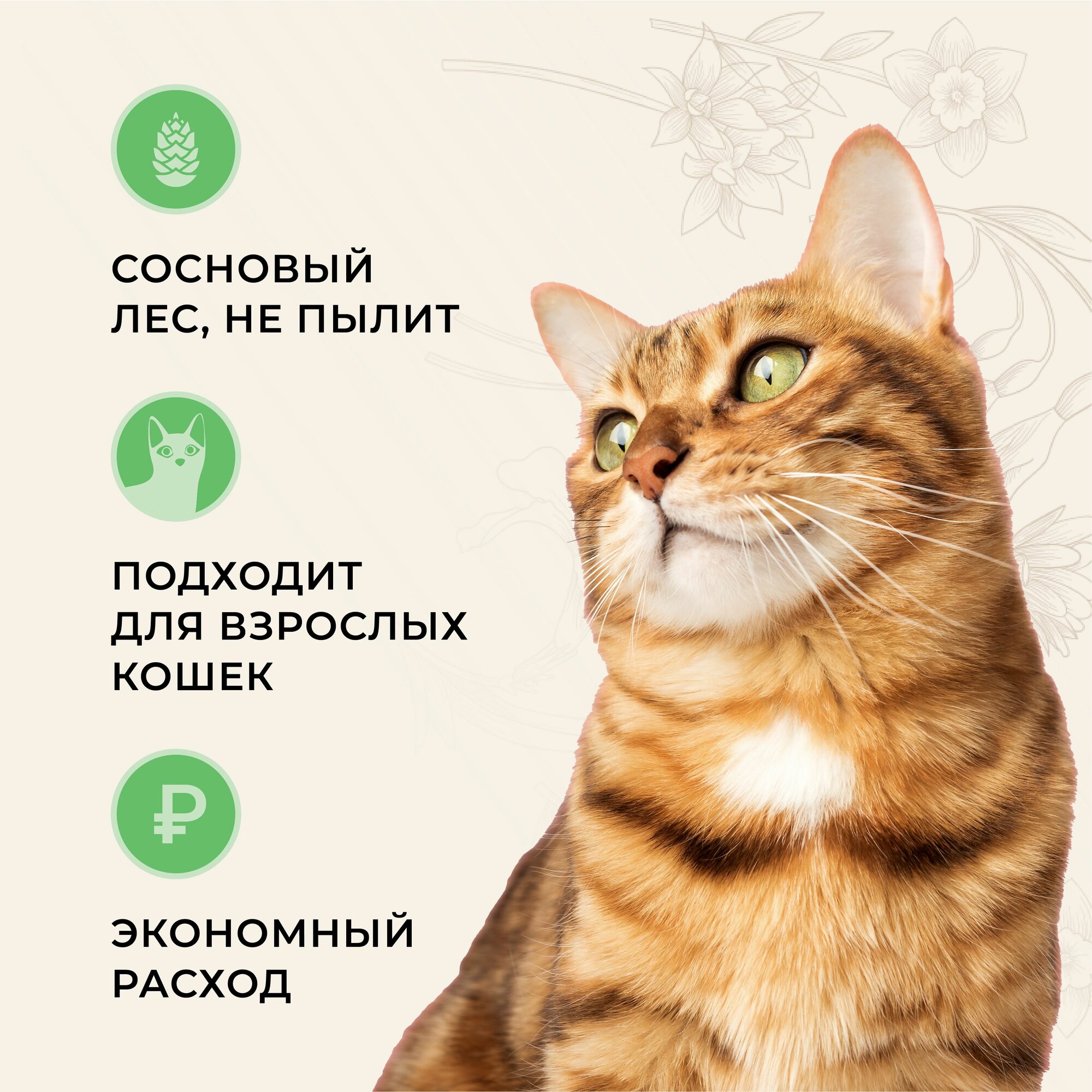 | Информация от производителя | с ароматом хвои; гранулы 0.6 - 2.25 мм; не пылит; впитывание 300 - 330% |