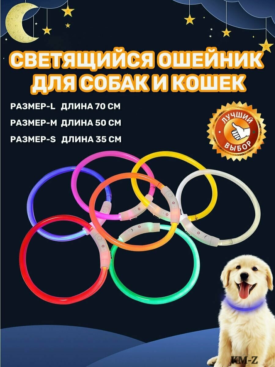 Купить Ошейник светодиодный для собак светящийся, usb зарядка в комплекте, цвет оранжевый. Размер-L 70 см.