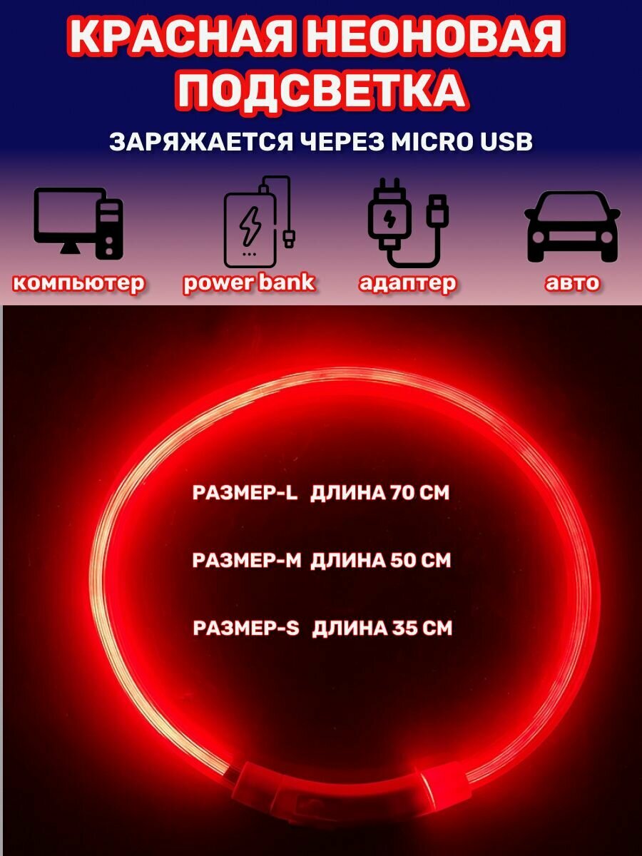 Купить Ошейник светодиодный для собак светящийся, usb зарядка в комплекте, цвет красный. Размер-L 70 см.