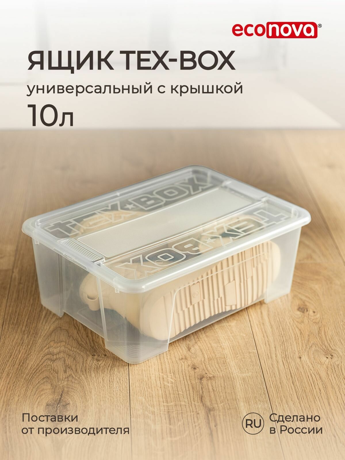 | Комплектация | Ящик универсальный с крышкой Tex-box 10 литров, 38*28*14 см (прозрачный), Econova |