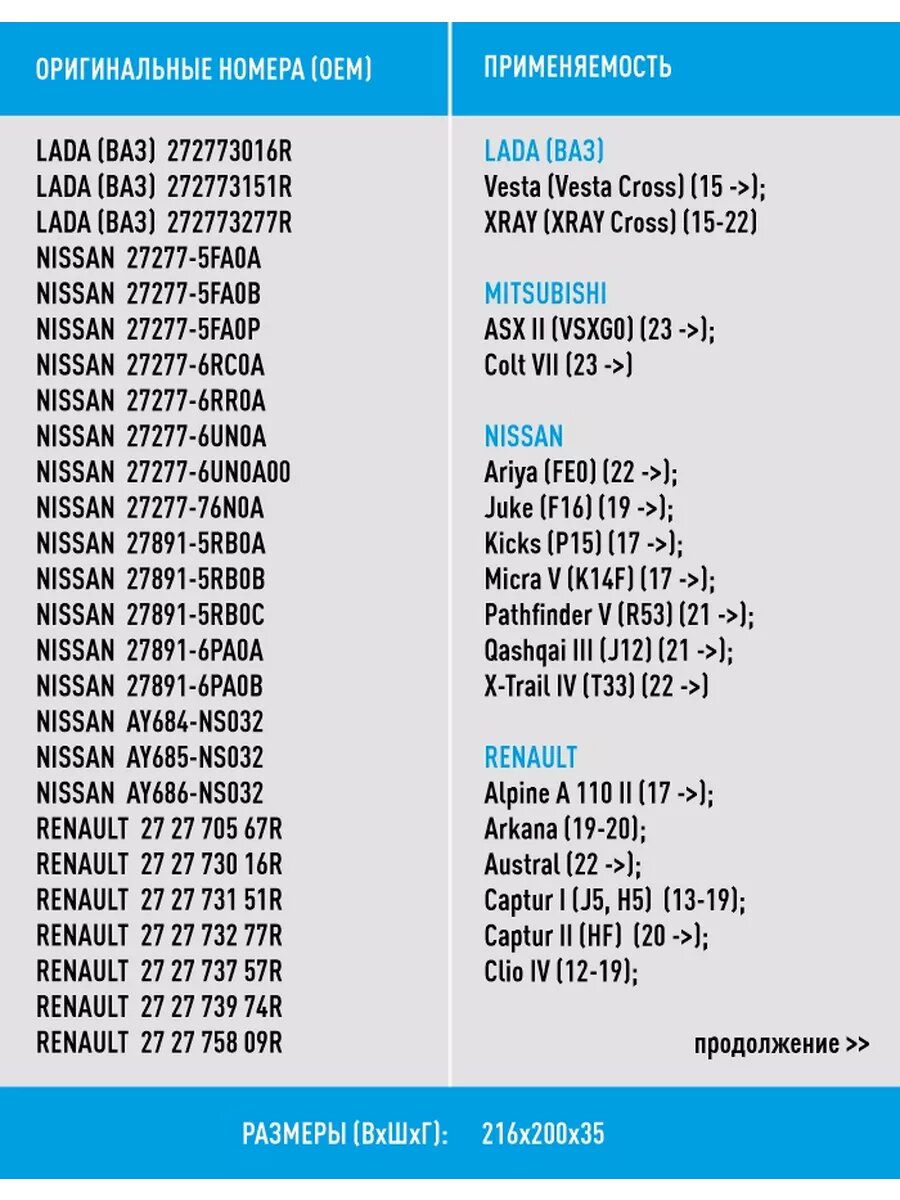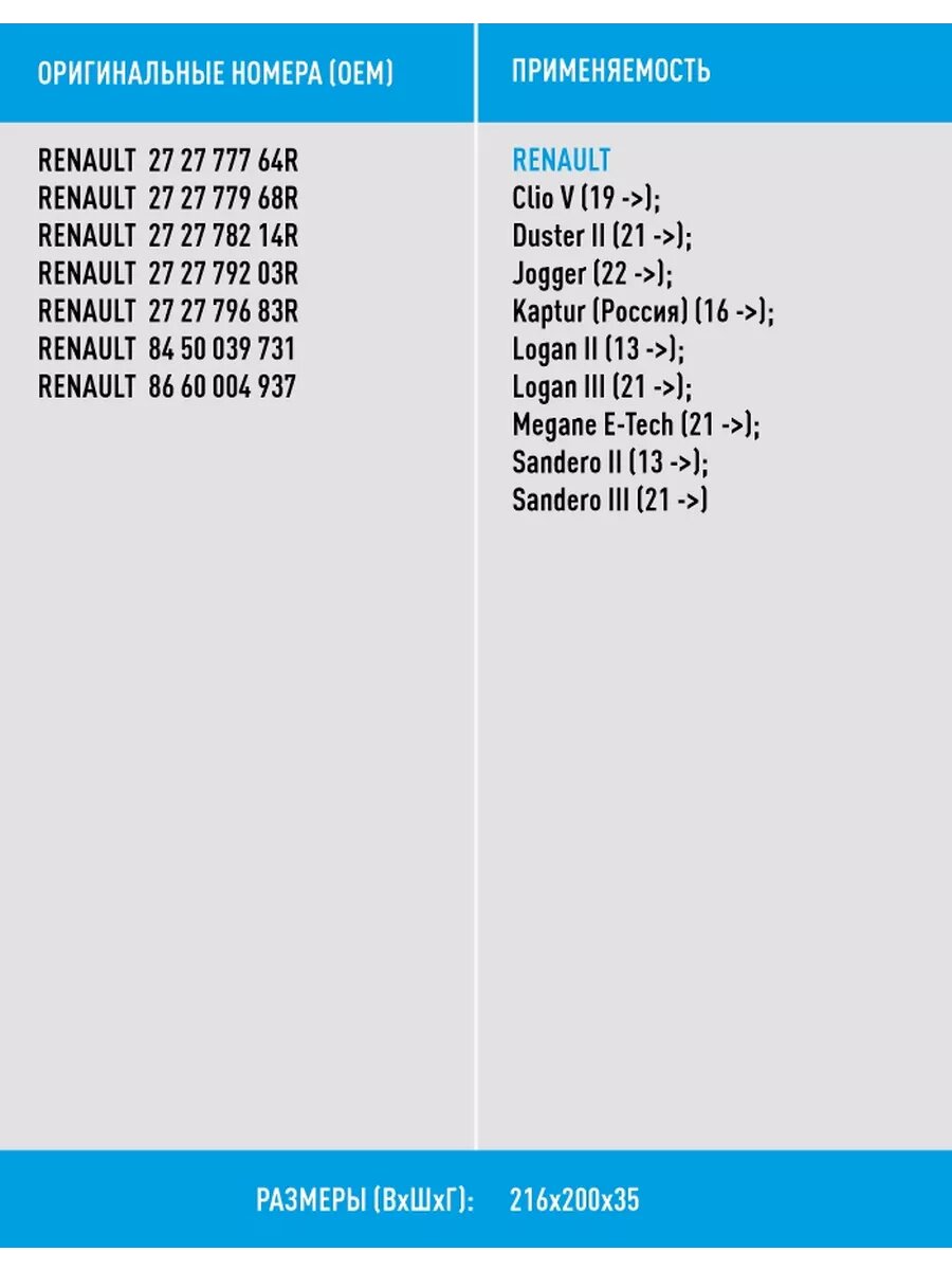 | Модель автомобиля | Great Wall Safe / LADA Largus / LADA Largus Cross / LADA Vesta / LADA Vesta SW Cross / LADA X-RAY / Lada Vesta SW / Mitsubishi ASX / Nissan Juke / Nissan Micra / Renault Arkana / Renault Captur / Renault Clio / Renault Duster / Renault Kaptur / Renault Logan / Renault Sandero |