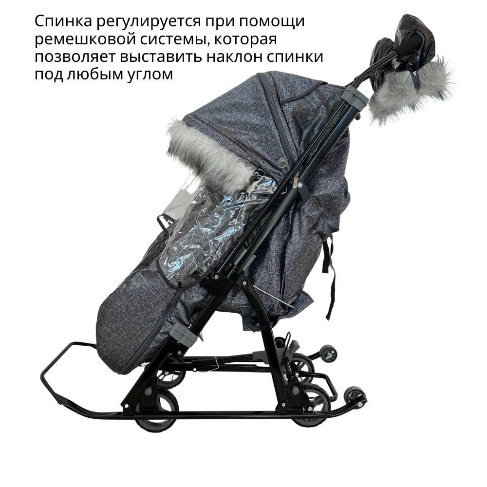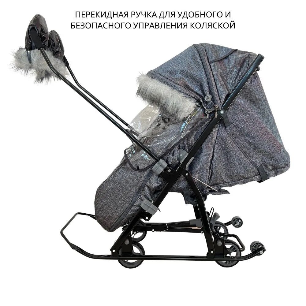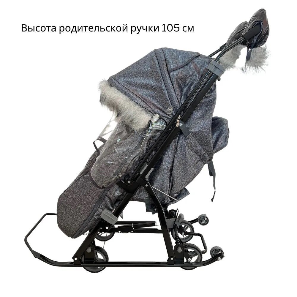 Санки-коляска "Galaxy NOVA" с колесной базой, с перекидной ручкой, черный крупный лен интересное: