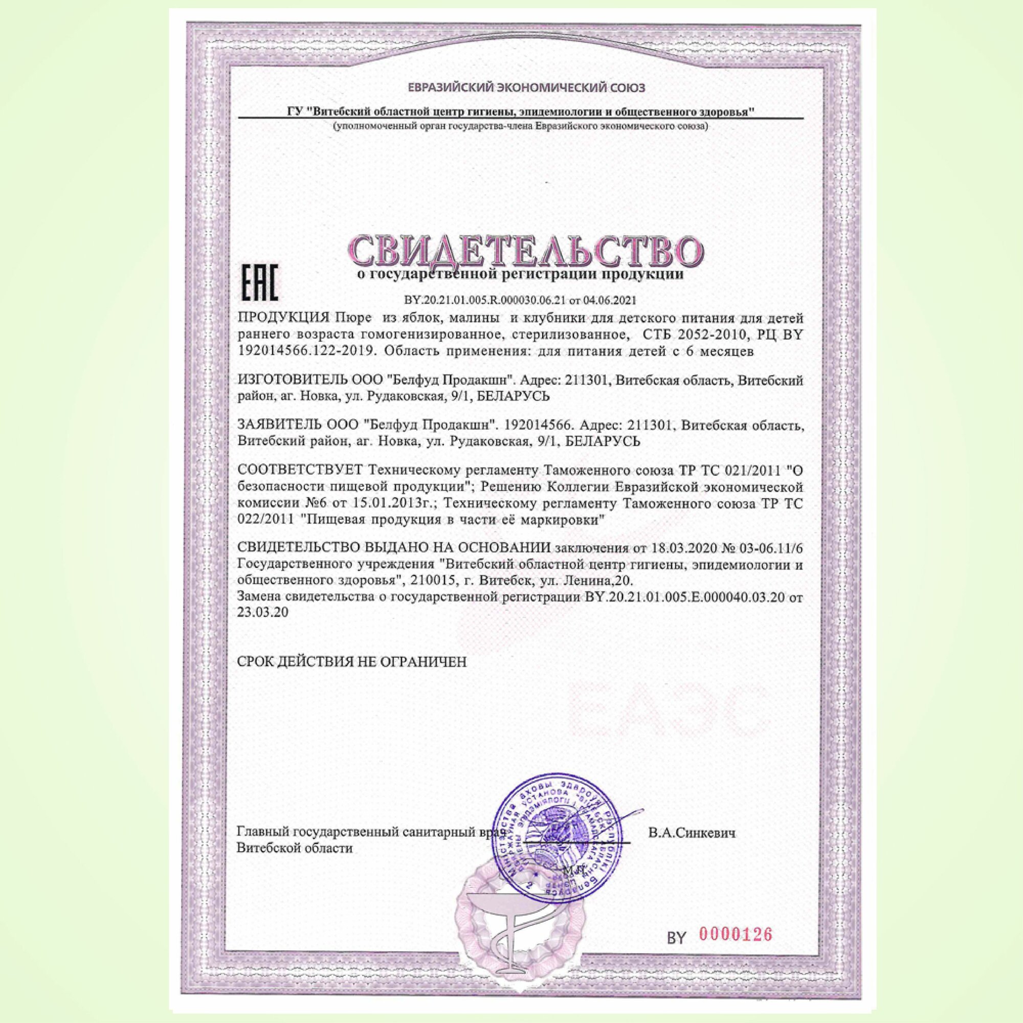 | Состав | пюре яблочное, пюре малиновое, пюре клубничное |