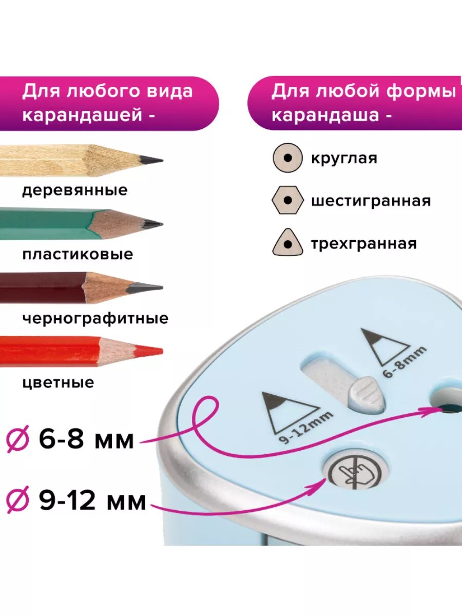 СохранитьТочилка электрическая BRAUBERG DUAL (для 2 диаметров карандашей!), 4 батарейки АА, голубая интересное: