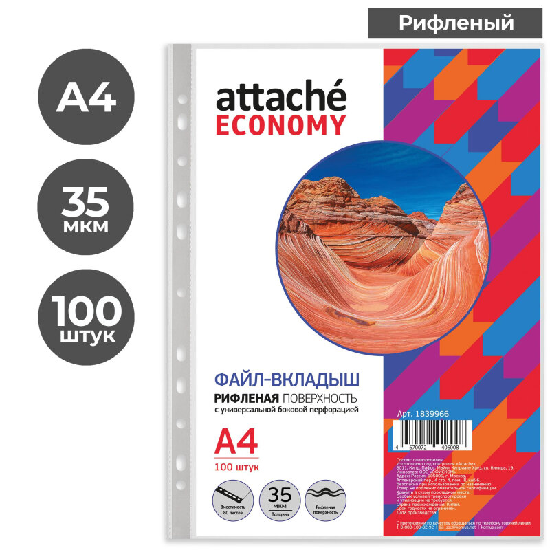 | Дополнительная информация | Файл-вкладыш Attache А4 35 мкм прозрачный рифленый 100 штук в упаковке |