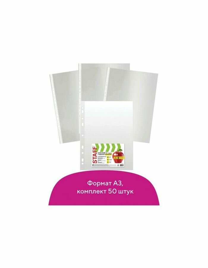 Папки-файлы перфорированные А3 STAFF, в упаковке 50шт вертикальные гладкие Яблоко 0,035мм 225769