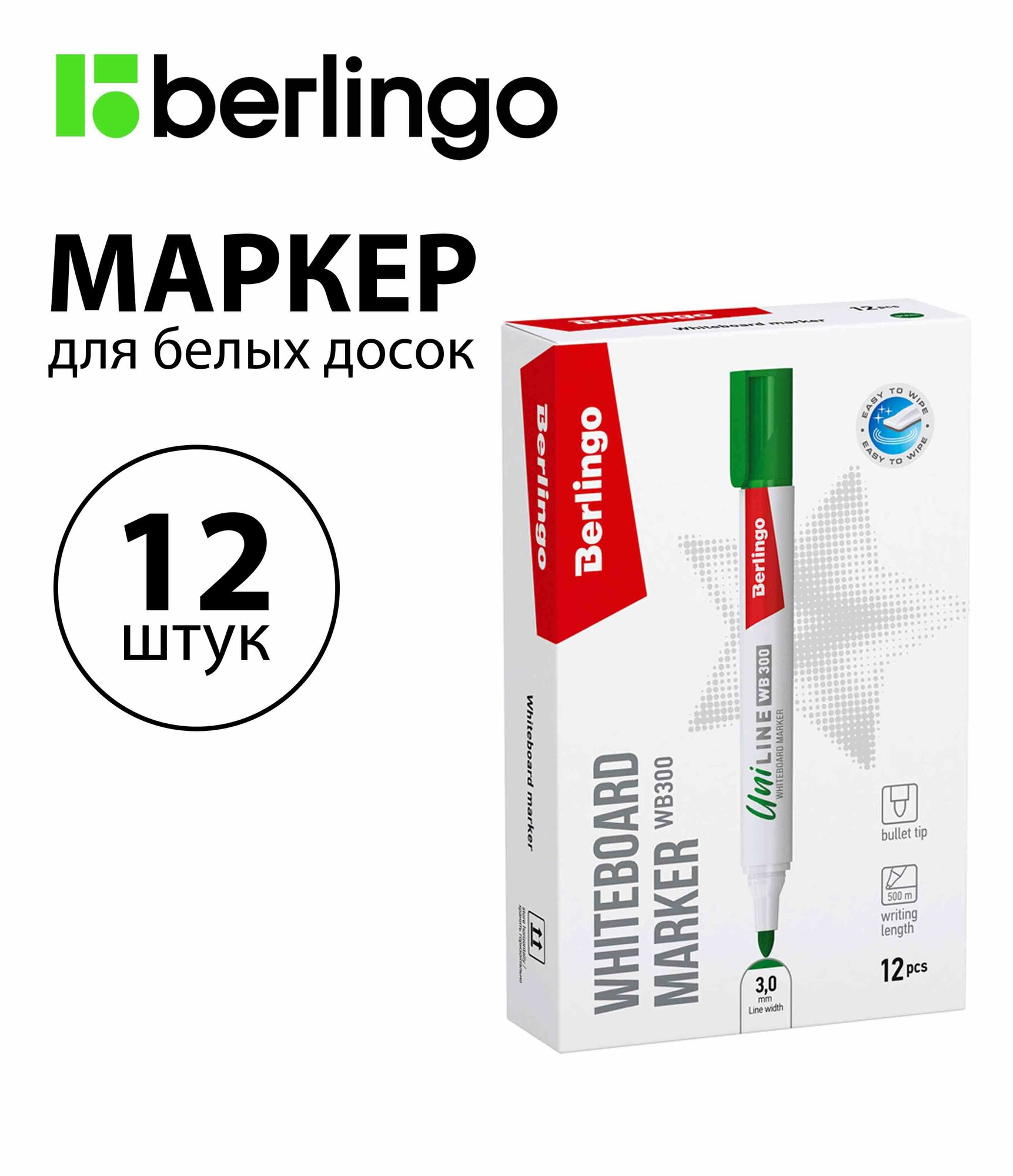 Купить Набор 12 шт. - Маркер для белых досок Berlingo "Uniline WB300", зеленый, пулевидный наконечник, 3 мм PM6411