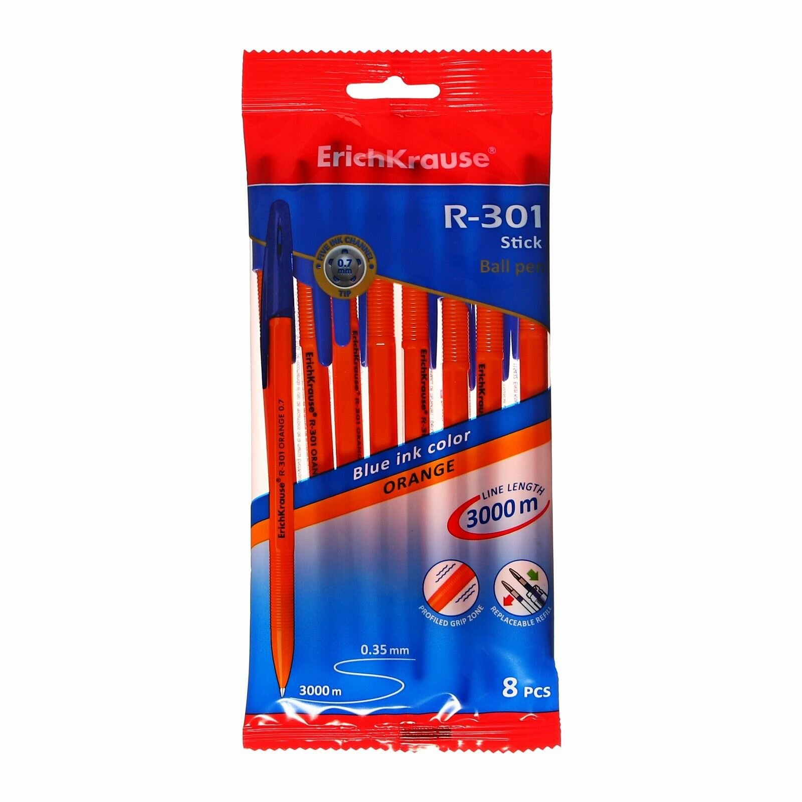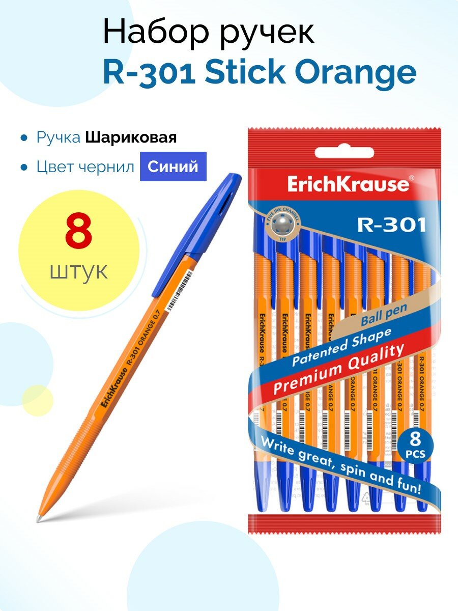Купить Набор из 8 ручек шариковых ErichKrause R-301 Stick&Grip Orange 0.7, цвет чернил синий (в пакете)