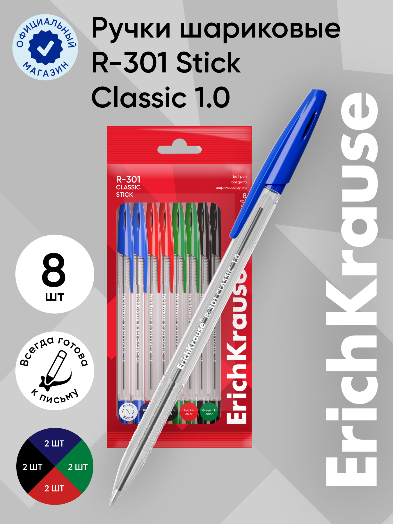 Купить Набор из 8 ручек шариковых ErichKrause R-301 Stick Classic 1.0, цвет чернил: синий, черный, красный, зеленый