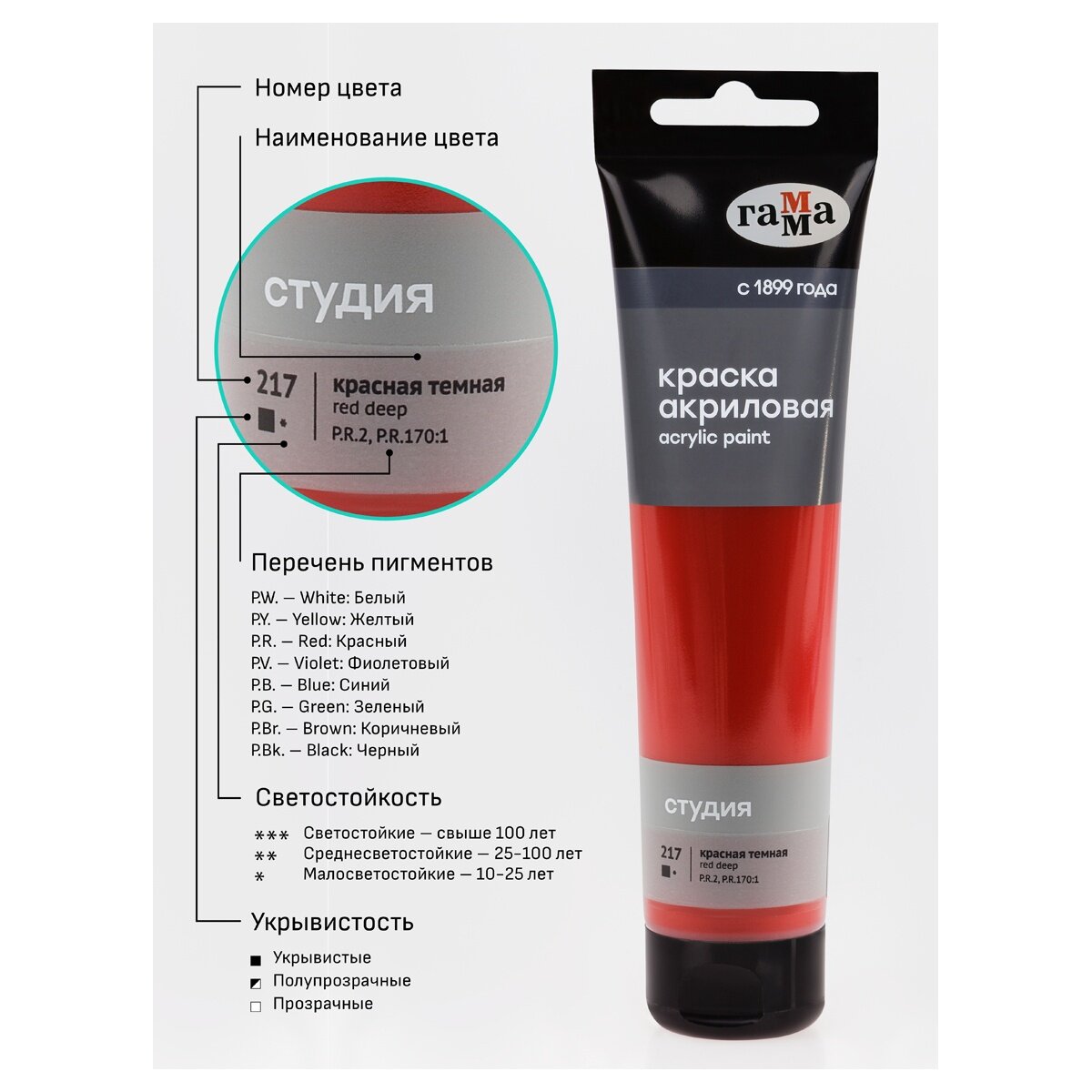 Краска акриловая художественная Гамма "Студия", пластиковая туба, 75мл, красная темная (280220217)
