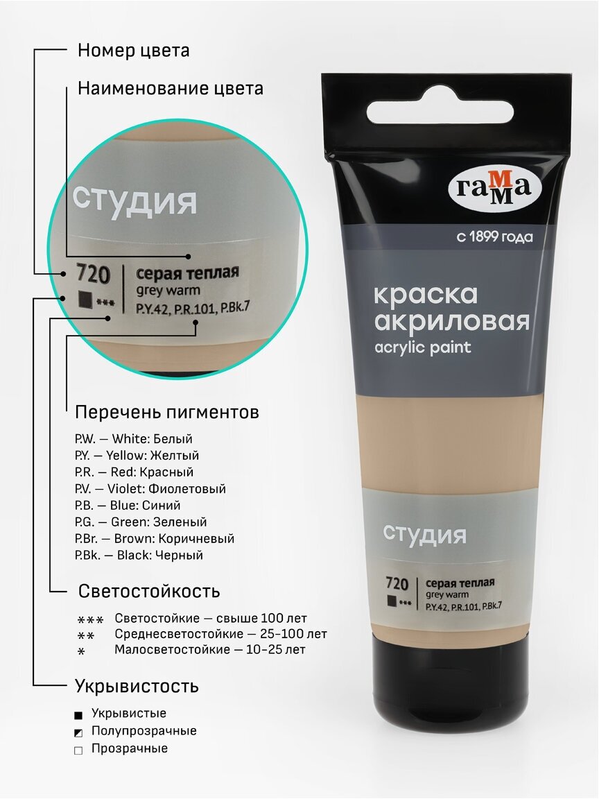 Купить Краска акриловая художественная Гамма "Студия", 75мл, пластиковая туба, серая теплая (арт. 356442)