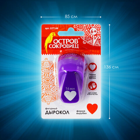 Дырокол фигурный "Сердце", диаметр вырезной фигуры 16 мм, остров сокровищ, 227148