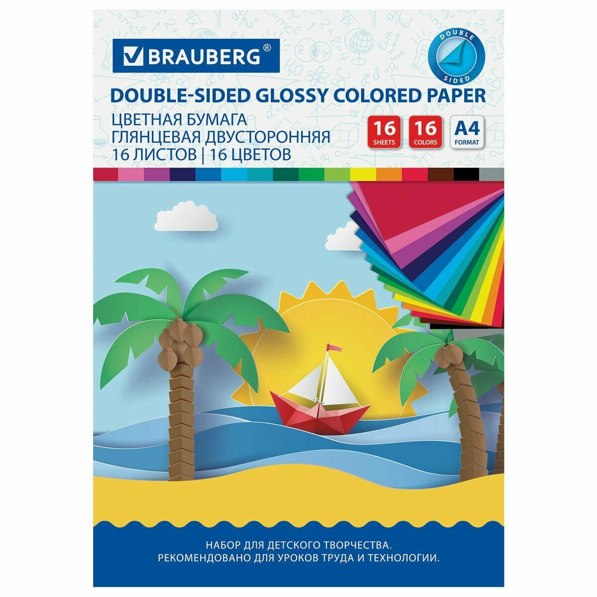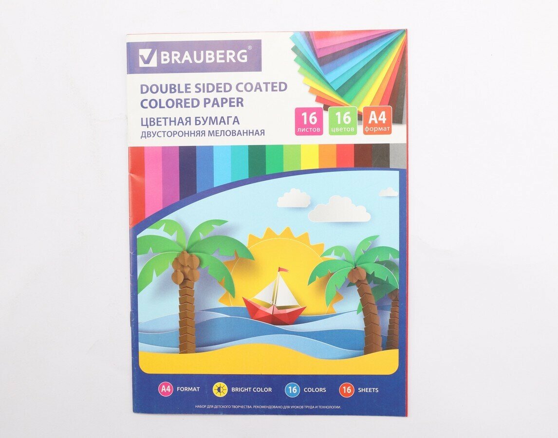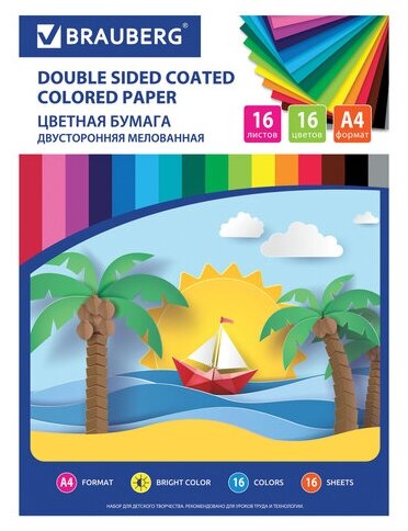 Бумага цветная двусторонняя мелованная Brauberg Эко "Кораблик" (16 листов, 16 цветов, А4) (111327), 50 уп.