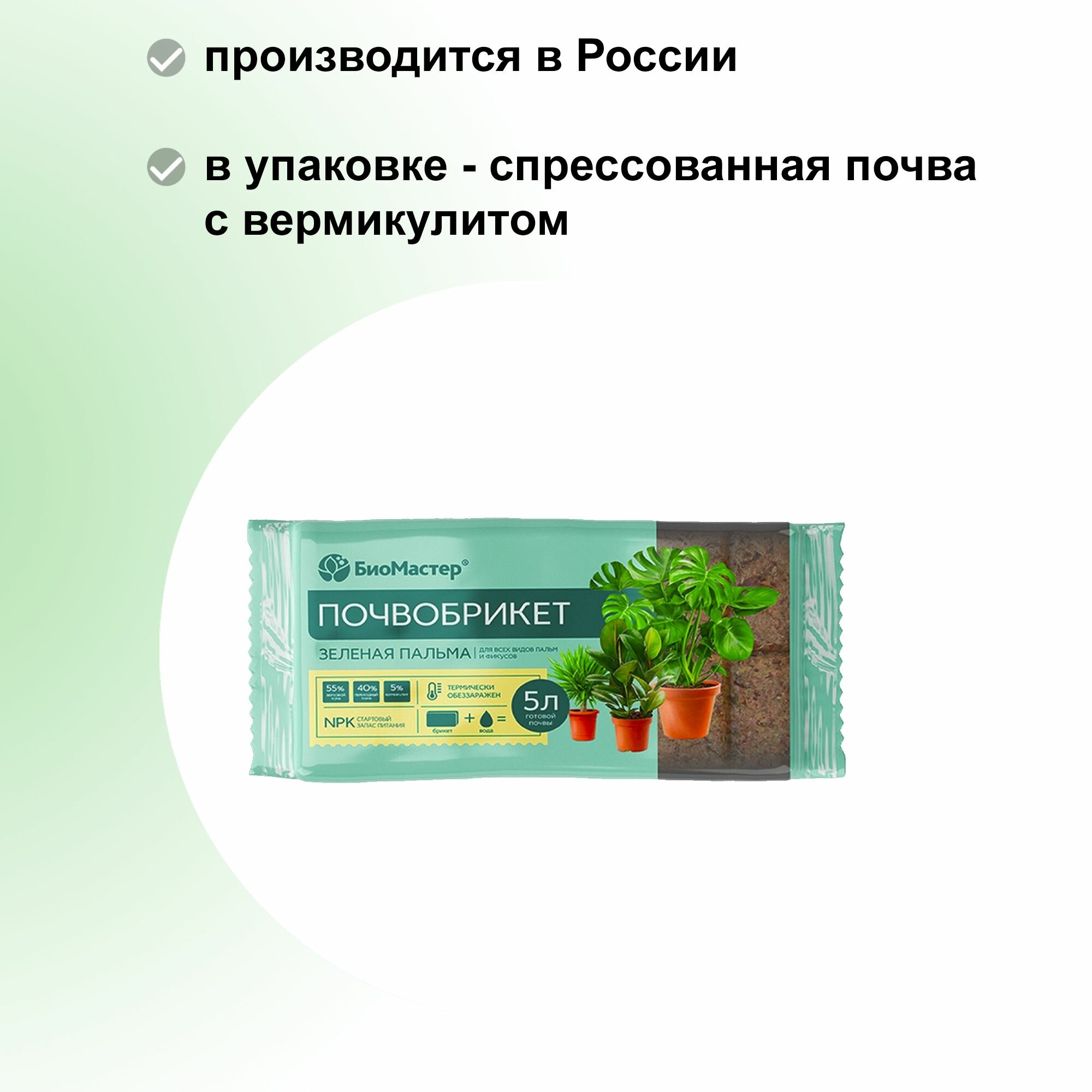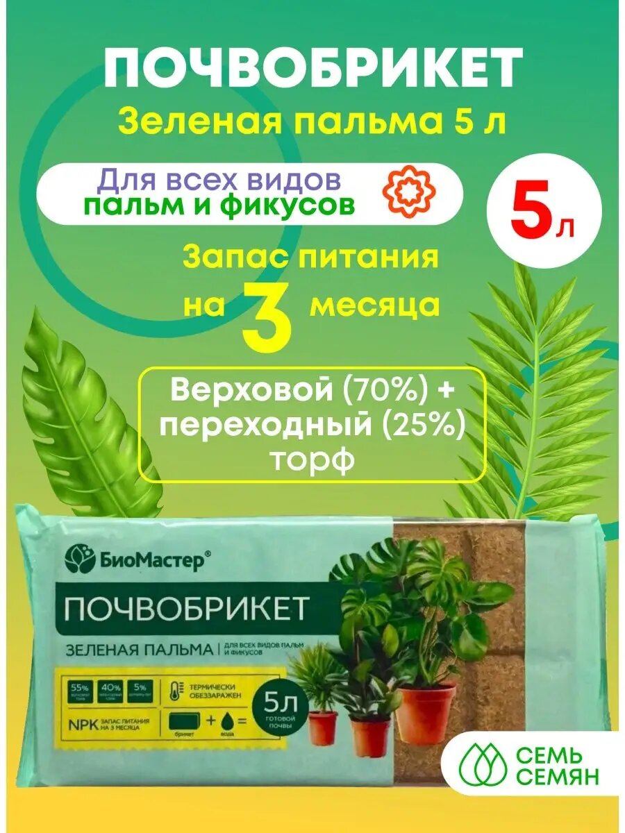 Почвобрикет/грунт для выращивания пальм/фикусов/драцен и других декоративно-лиственных растений Зеленая пальма 5л
