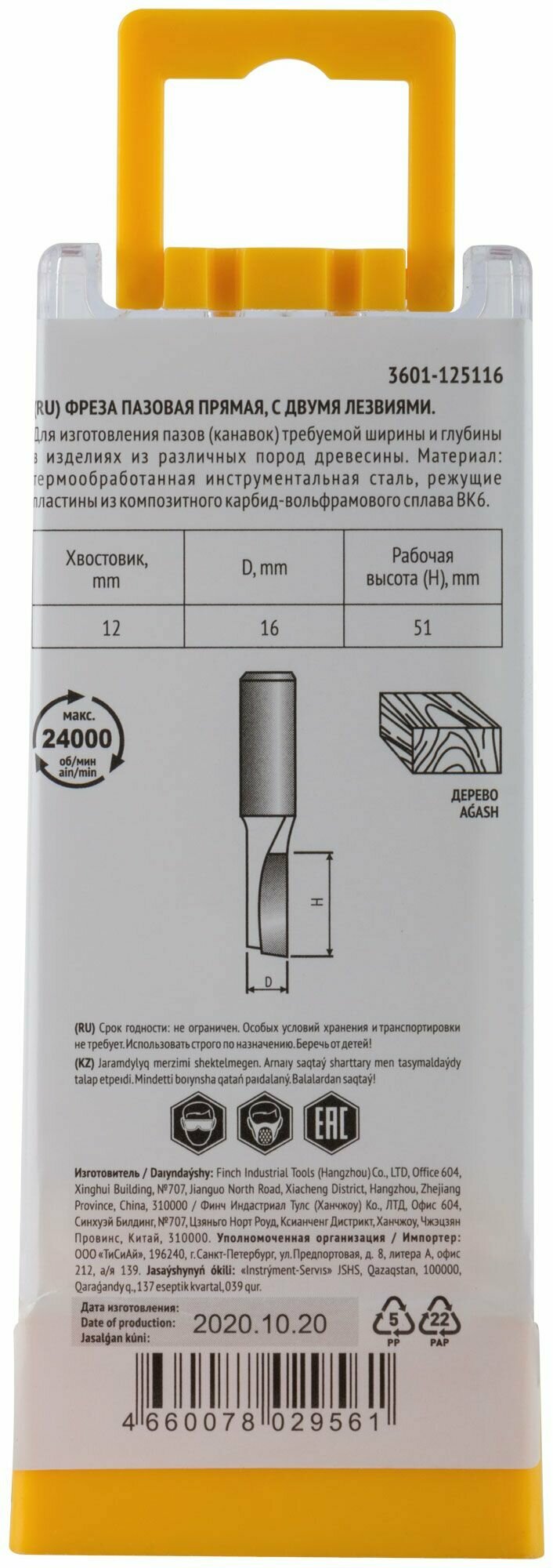 Купить FIT Фреза по дереву пазовая прямая с двойным лезвием хвостовик 12 мм DxHxL 16х51x87 мм арт. 3601-125116