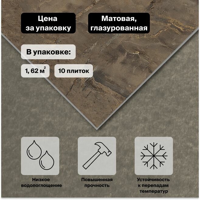 | Дополнительная информация | тон (оттенок) плитки может отличаться от партии к партии; каждая новая партия плитки имеет оттенок, отличающийся от оттенка предыдущей партии в силу особенностей производственного процесса плитки; отличие тона плитки разных партий не является производственным браком продукции |