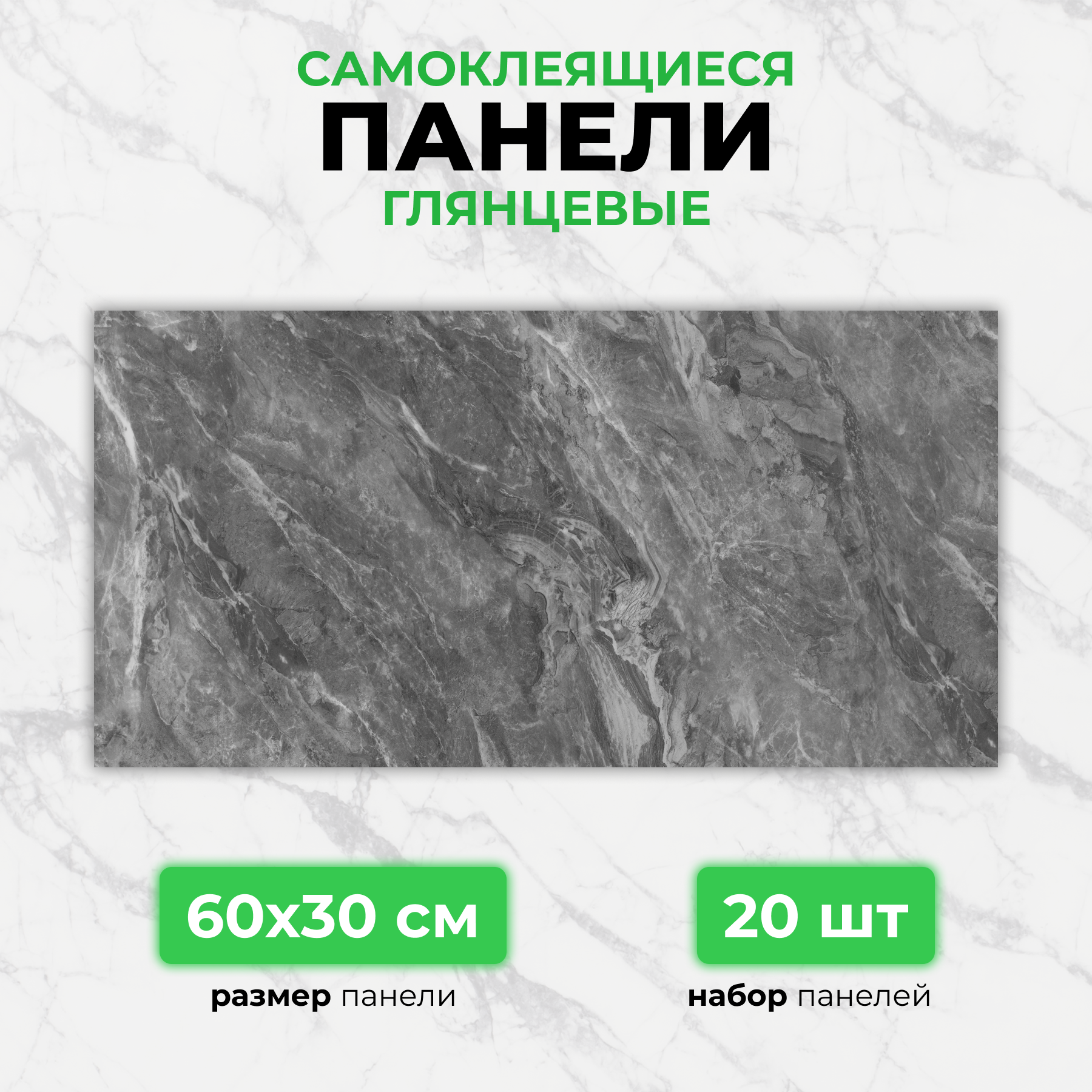 Серый мрамор, 60х30 см плитка глянцевая, самоклеющиеся панели для стен, декор для дома на кухню, в ванную (арт. 89) 18 шт.