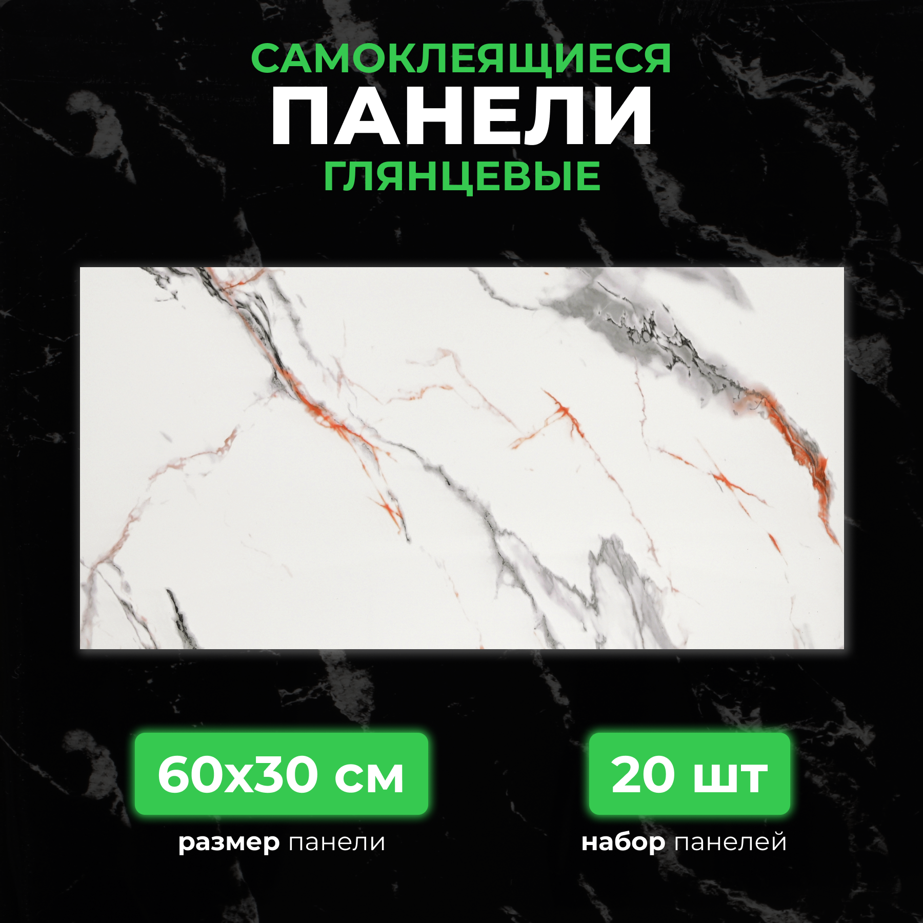 Белый мрамор, 60х30 см плитка глянцевая, самоклеющиеся панели для стен, декор для дома на кухню, в ванную (арт. 112) 20 шт.