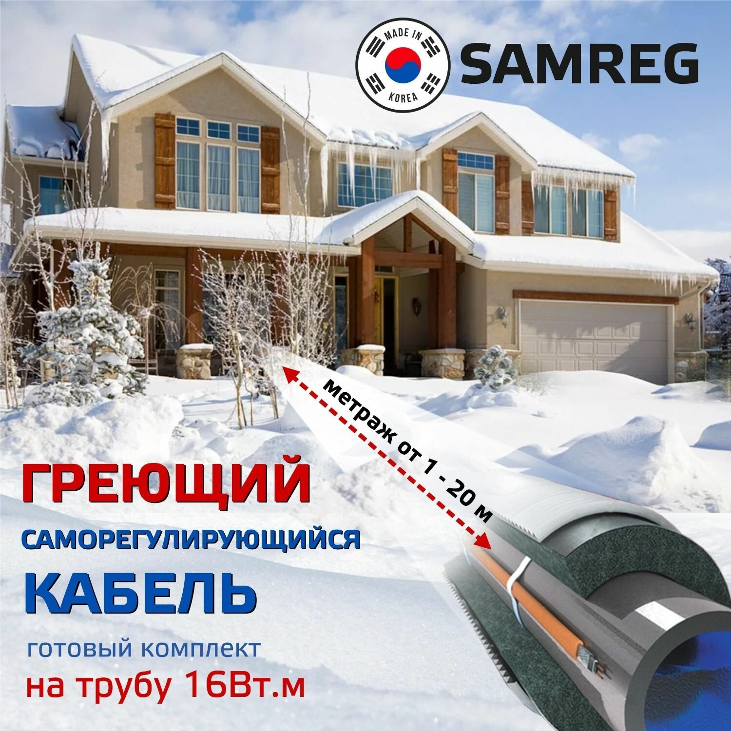 Готовый комплект греющего кабеля саморегулирующегося Samreg 16-2 (8м) для обогрева труб снаружи 16Вт