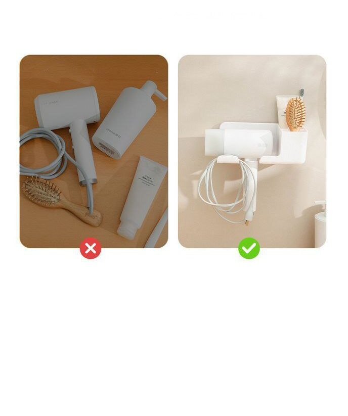 Полка для фена bLESkYOU, СЕРЫЙ, с крючком и органайзером, пластик, настенный, самоклеящийся, без сверления.