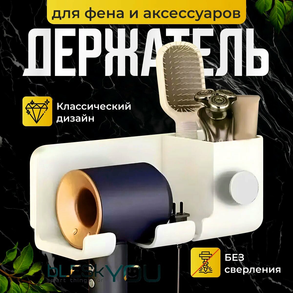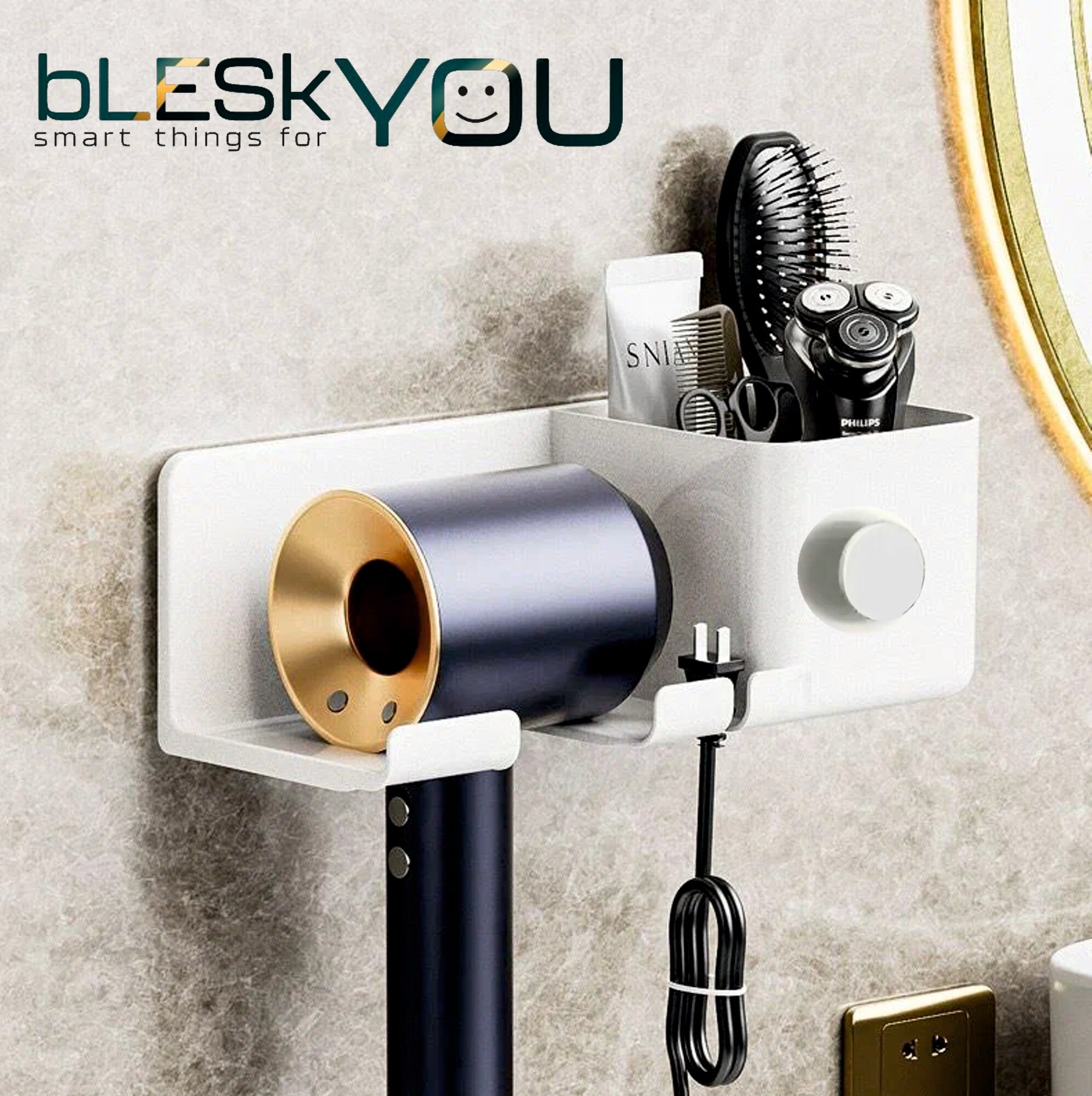 Купить Держатель для фена bLESkYOU, белый, без сверления, с крючком с органайзером, пластик, 22х9х9 см, настенный, самоклеящийся. 1 шт.