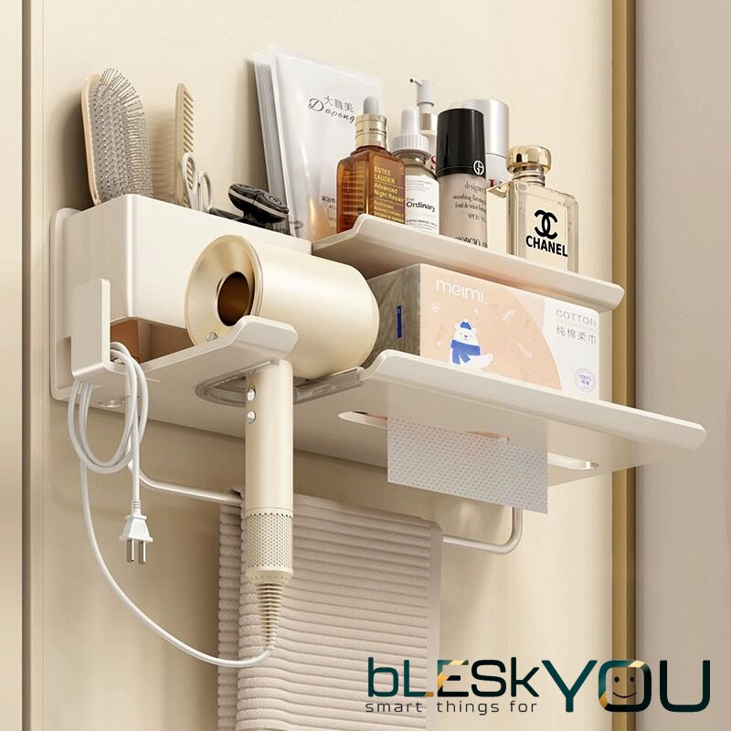 Полка для фена bLESkYOU, БЕЛЫЙ, с крючком и органайзером, пластик, настенный, самоклеящийся, без сверления.