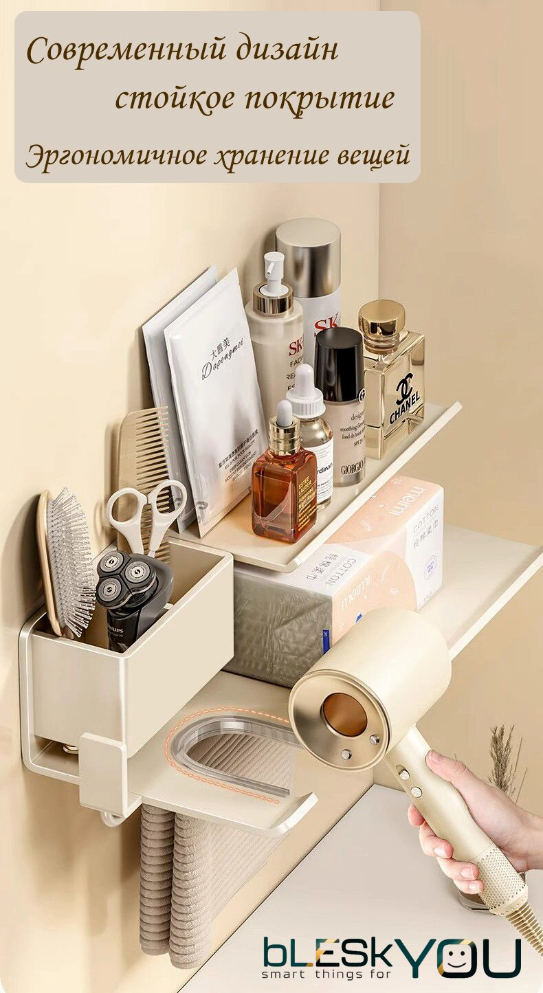 СохранитьДержатель для фена bLESkYOU, алюминий, бело-бежевый, без сверления, с полотенцедержателям. интересное: