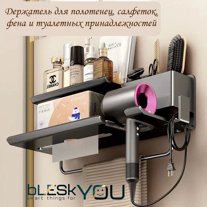 СохранитьДержатель для фена bLESkYOU, алюминий, серый, без сверления, с полотенцедержателям. интересное: