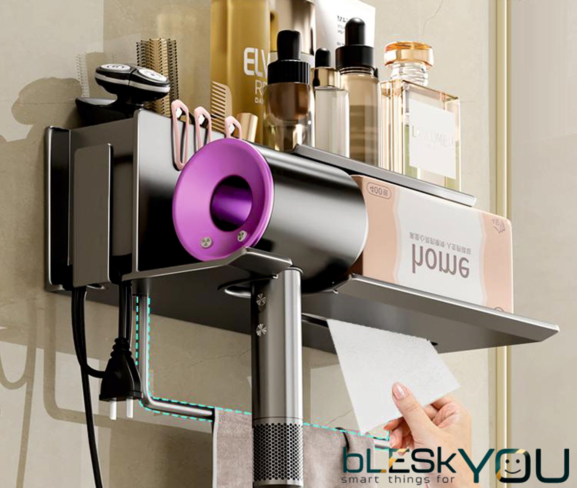 Полка для фена bLESkYOU, БЕЛЫЙ, с крючком и органайзером, пластик, настенный, самоклеящийся, без сверления.