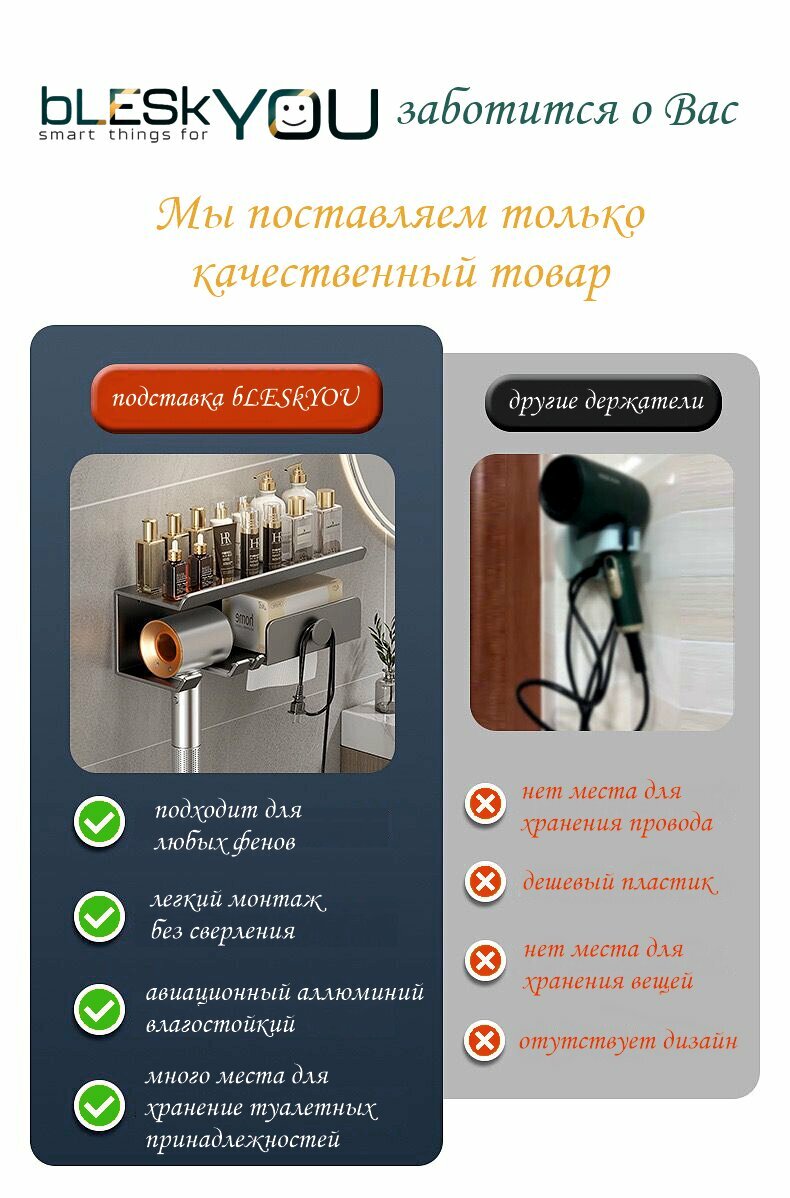 Держатель для фена bLESkYOU, серый, без сверления, с крючком с органайзером, пластик, 22х9х9 см, настенный, самоклеящийся. 1 шт.