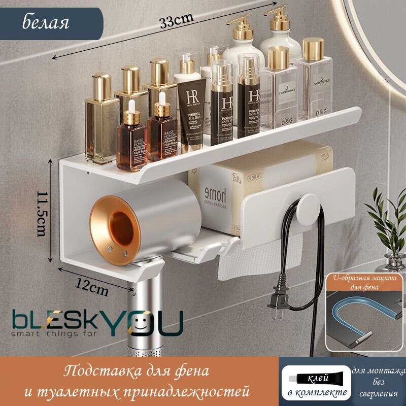 Держатель для фена bLESkYOU, белый, без сверления, с крючком с органайзером, пластик, 22х9х9 см, настенный, самоклеящийся. 1 шт.