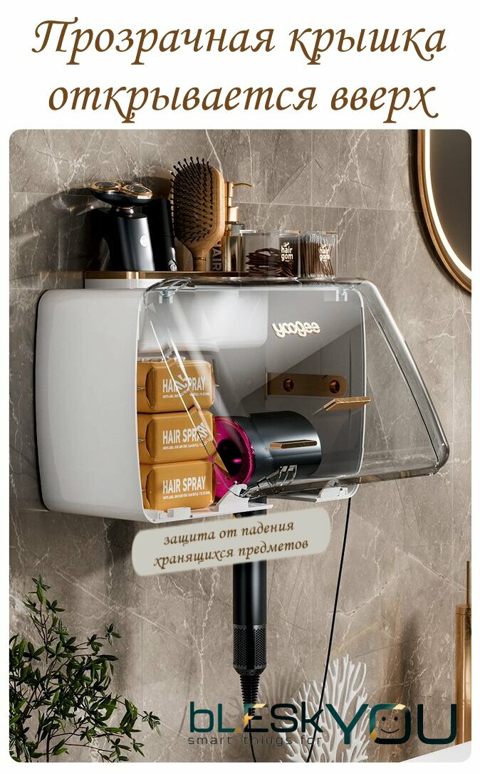 Полка для фена bLESkYOU, БЕЛЫЙ, с крючком и органайзером, пластик, настенный, самоклеящийся, без сверления.