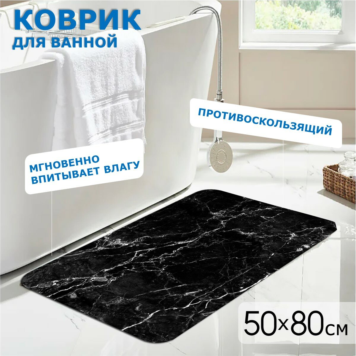 Коврик для ванной и туалета Ridberg Marble 50*80 см, влаговпитывающий, быстросохнущий, противоскользящий, прикроватный коврик, черный