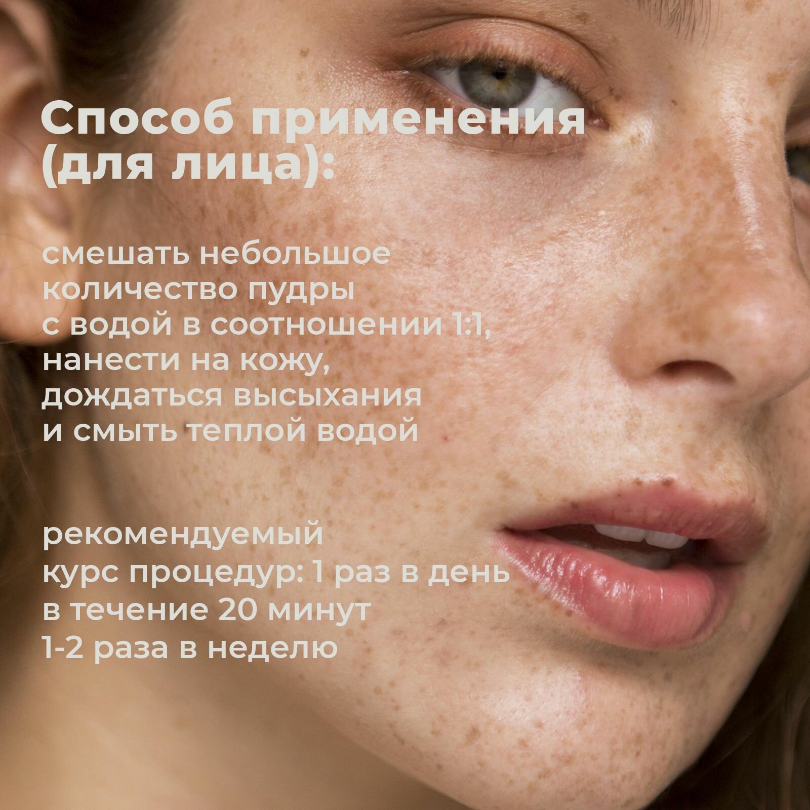| Способ применения | нанести небольшое количество пудры на очищенную кожу, подождать 15-20 минут, смыть теплой водой или очистить кожу при помощи салфетки. Рекомендуемый курс процедур при появлении комедонов и гнойничков: 1 раз в день в течение 20 минут в течение 5 дней. |