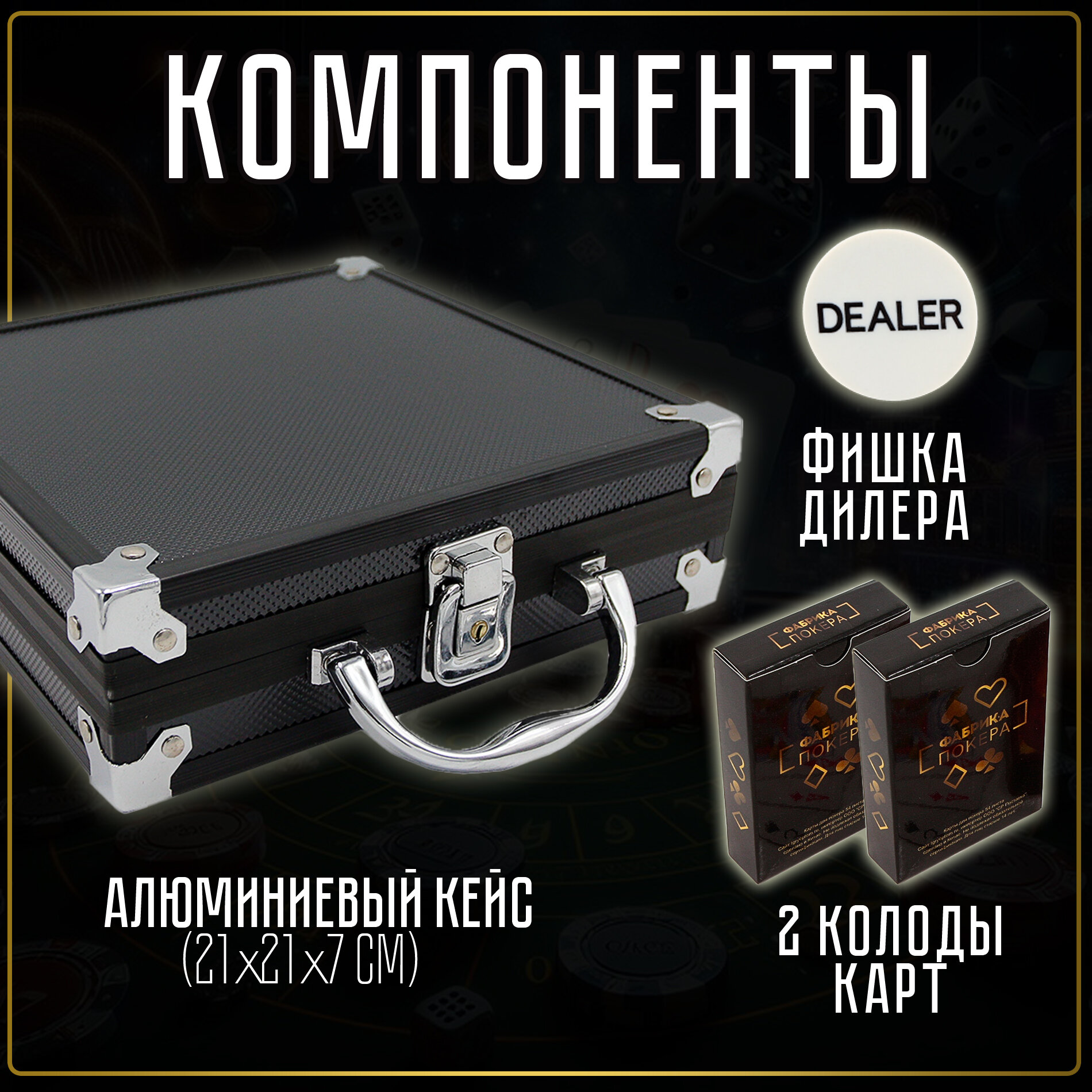 | В наборе | 100 фишек номиналом, Фишка дилера, 2 колоды, 2 ключа для кейса, кейс |