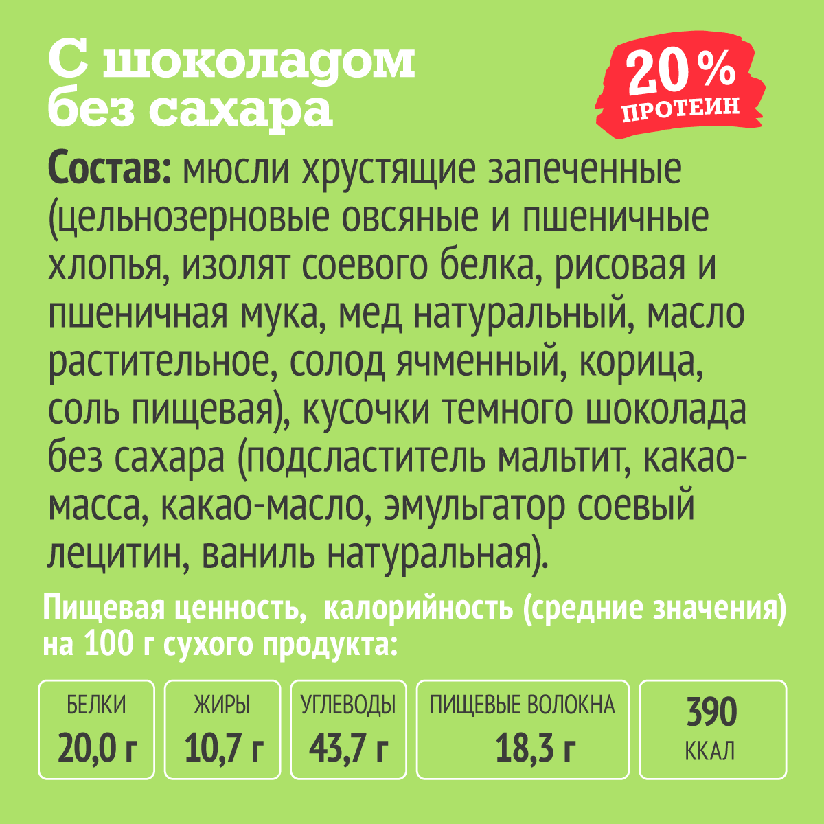 | Состав | мюсли хрустящие запеченные (хлопья овсяные / изолят соевого белка / пшеничные отруби / пшеничная мука / рисовая мука / масло подсолнечное / подсласти- тель эритрит (из растительного сырья) / овсяные отруби / инулин / солод ячменный / соль пищевая) / кусочки темного шоколада без сахара (подсластитель мальтит / какао-масса / какао-масло / эмульгатор соевый лецитин / ваниль натуральная) |