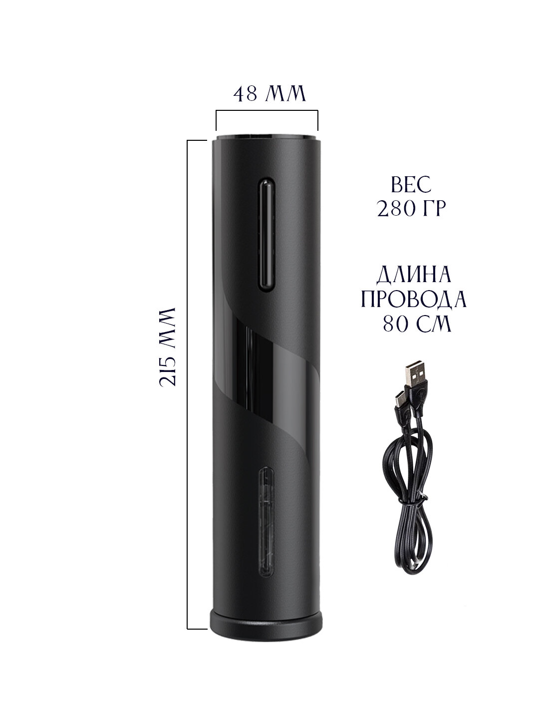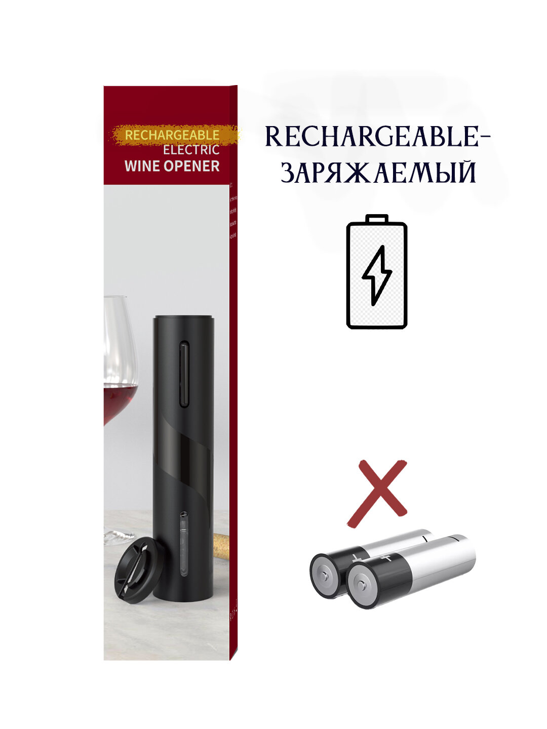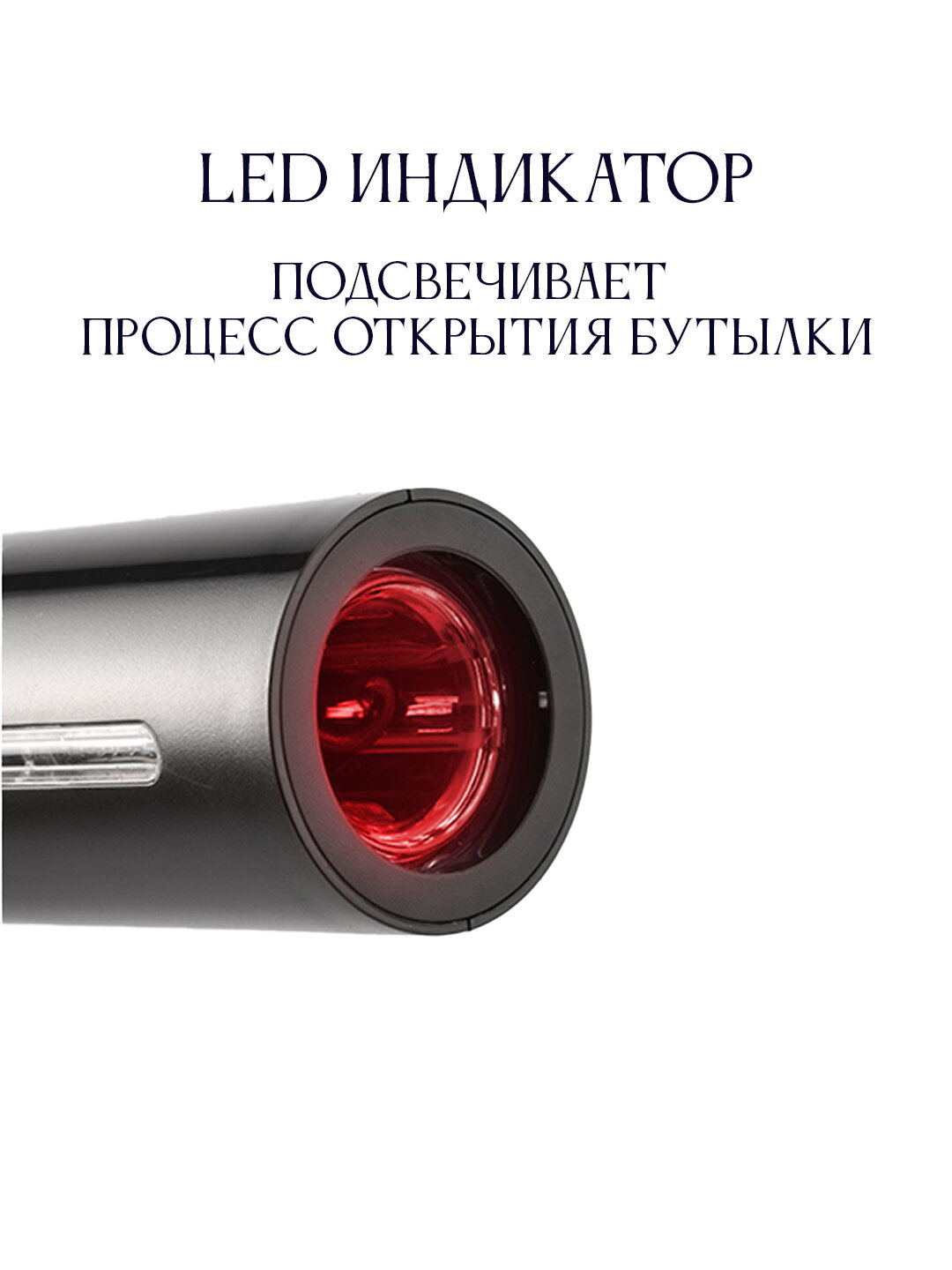 | Дополнительная информация | подходит для открытия бутылок с вином и не подходит для открытия бутылок с шампанским; в комплектацию входит штопор, нож для фольги, провод USB/Type-C. |