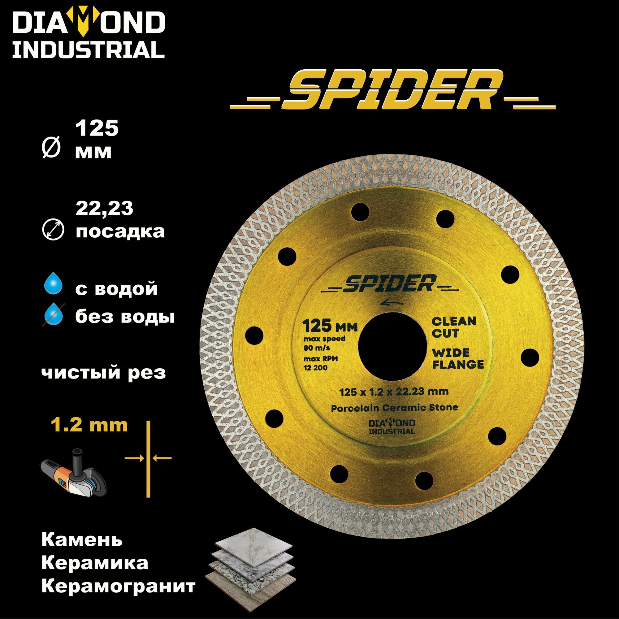 Диск алмазный по керамограниту Diamond Industrial Spider 125x22,23x1,2 мм турбо сухой рез