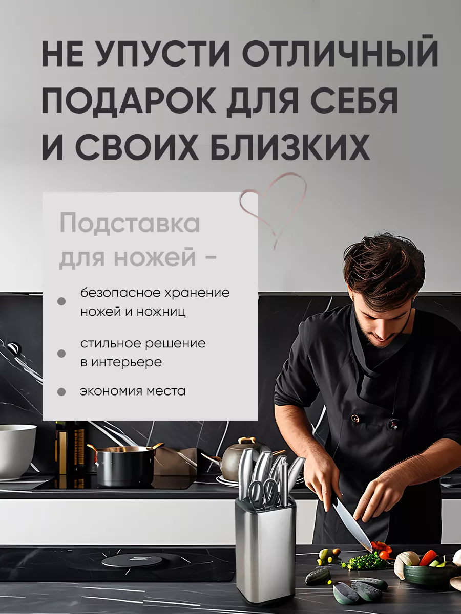 | Дополнительная информация | подставка для ножей, подставка для кухонных ножей, органайзер для кухни, подставка для столовых приборов, подставка для ножей кухонных, подставка для кухонных принадлежностей, держатель для ножей, подставка для кухонных приборов, подставка под ножи, нержавеющая сталь |
