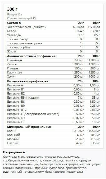 | Состав | фруктоза, мальтодекстрин, глюкоза, изомальтулоза, сорбит,лимонная кислота, калия хлорид, лизина хлорид, л-глютамин, л-изолейцин, битартрат, магния цитрат, натрия цитрат, глицин, витаминный премикс, сукралоза, ароматизатор идентичный натуральному, бета-каротин (краситель) |