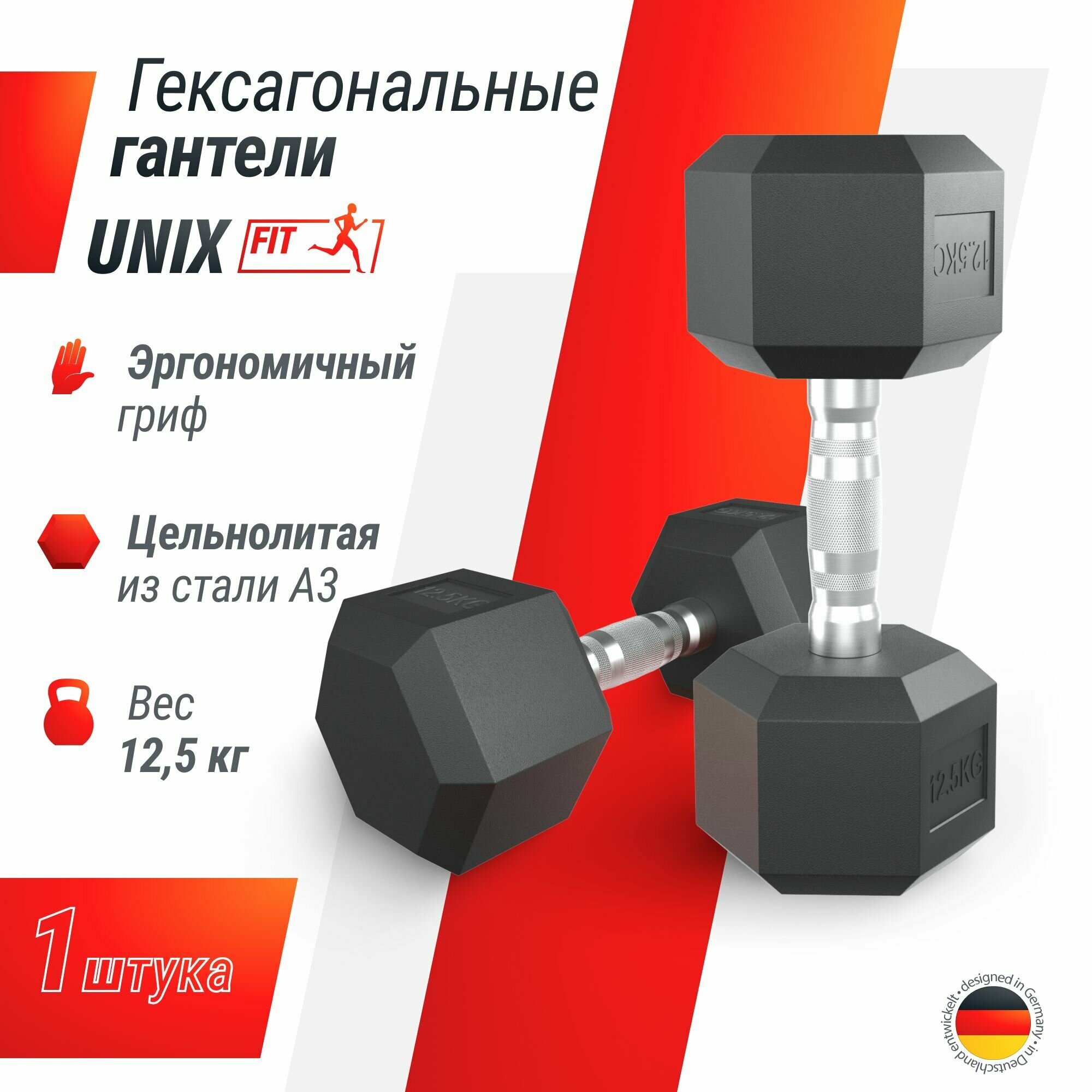 Купить Гантель гексагональная UNIX Fit обрезиненная, прорезиненная спортивная гантеля с металлической ручкой литая неразборная, 12,5 кг, 1 шт.