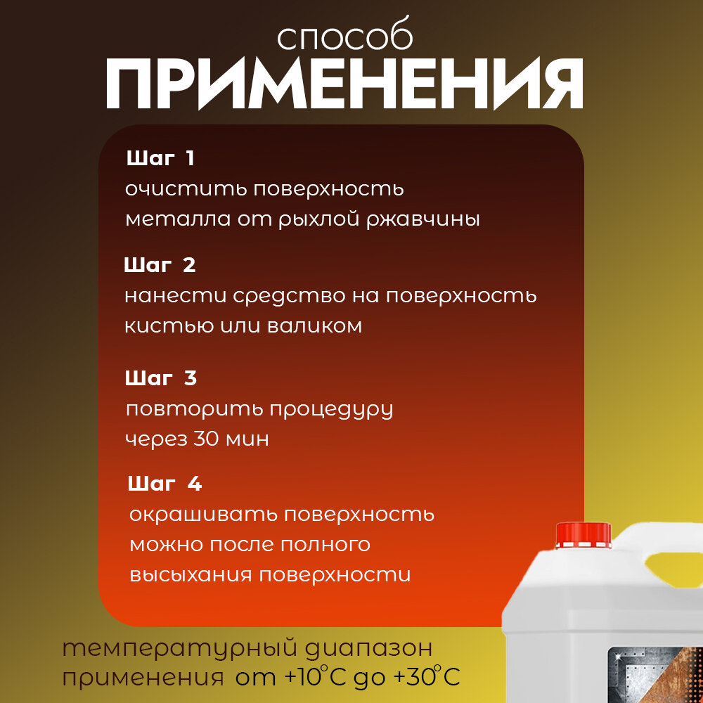 | Способ применения | Для достижения лучшего результата рекомендуется использовать при температуре окружающей среды не ниже +10°С. Очистить обрабатываемую поверхность от рыхлой ржавчины с помощью металлической щетки. Хорошо встряхнуть баллон. Нанести средство на обрабатываемую поверхность с помощью кисти или губки. Повторить обработку через 10-15 минут. Дать составу подействовать в течение 30-40 минут. Смыть большим количеством воды и насухо протереть обработанную поверхность ветошью. Наносить краску необходимо не позднее 2-х суток с момента обработки. Меры предосторожности: Осторожно! Содержит кислоту. Работать с применением средств индивидуальной защиты (перчатки, очки) в хорошо проветриваемом месте. |