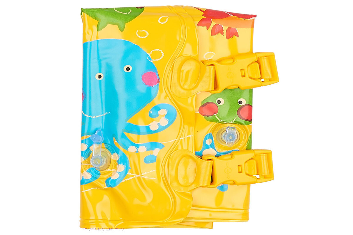 | Плюсы: | яркий, мягкий, застежки с защитой от детей, не пахнет. 3 независимых камеры - если одна прохудится во время игр, жилет останется на плаву. |