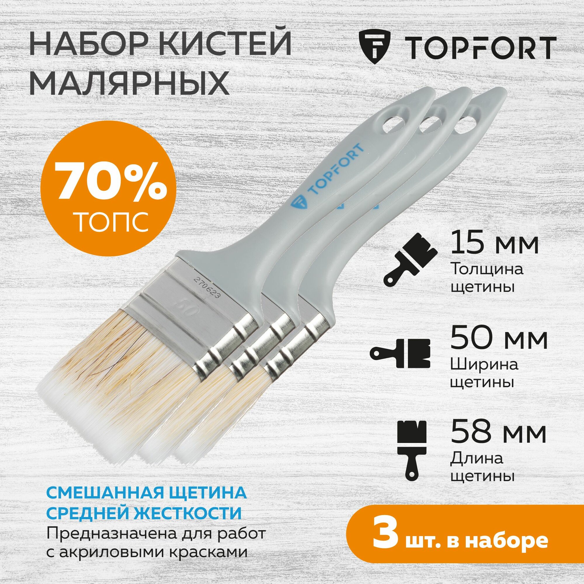 Кисть малярная TOPFORT акриловая, плоская, 50 х 15 мм, 3 штуки