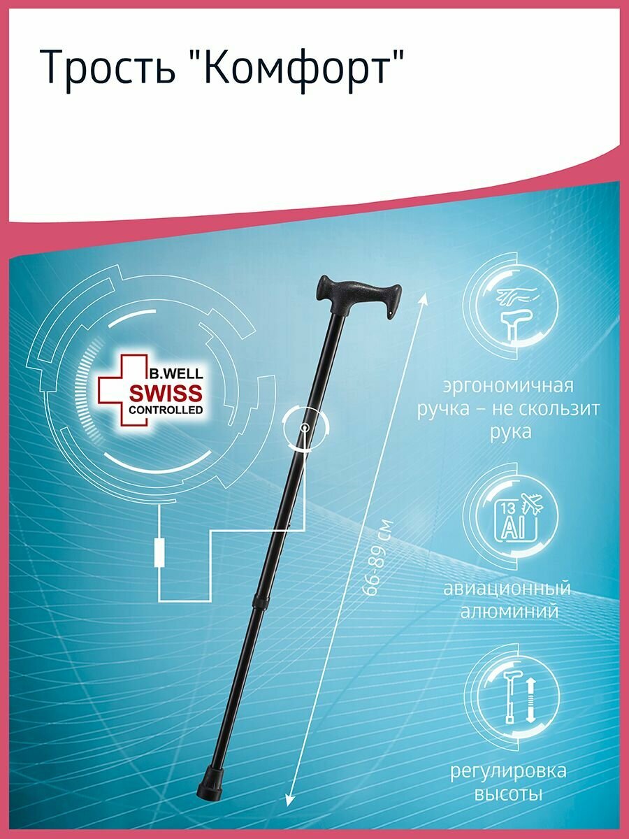 B.Well WR-416 / БиВелл - трость телескопическая, с рукояткой Комфорт, черная
